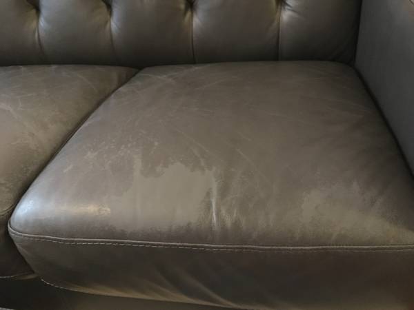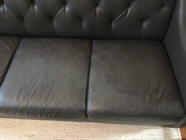 Some wear on the seats from use, but otherwise in great shape. Coming from a no-pets home. The leather is top grain (grade 3 semi aniline). Sofa dimensions are 76" x 33" x 33".