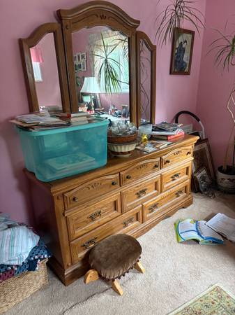 Wide Wood dresser with 3 rows of drawers. Folding mirror.