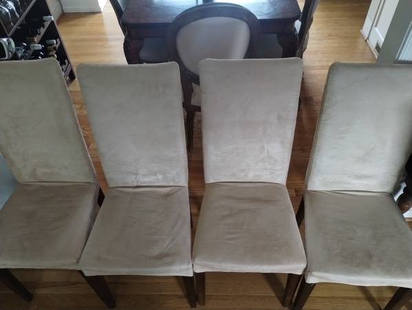 Four off-white microfiber dining chairs in good condition. Cash & Carry