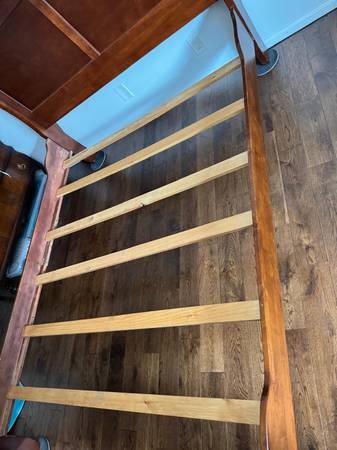 Wood queen sleigh bed in good condition. Very solid.