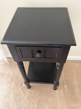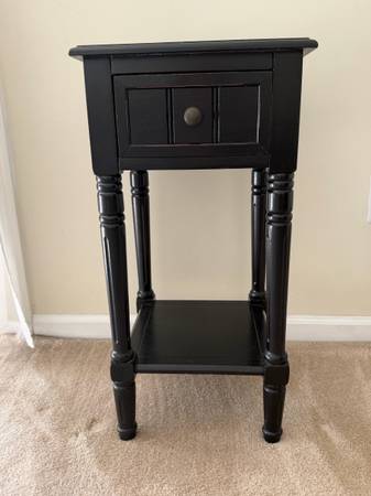 Black slightly distressed side or accent table. 14” L x 14” W x 28” H. $20 cash only