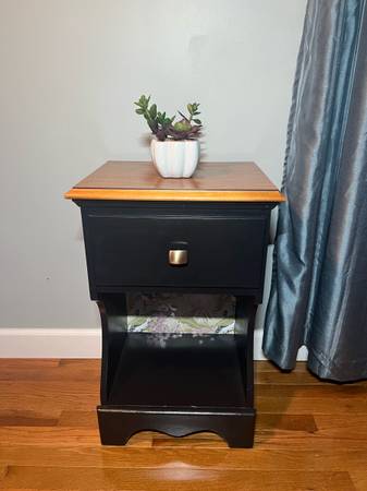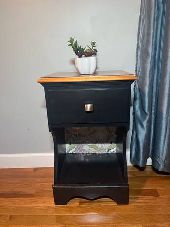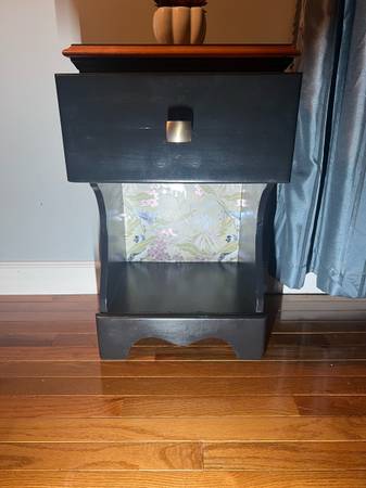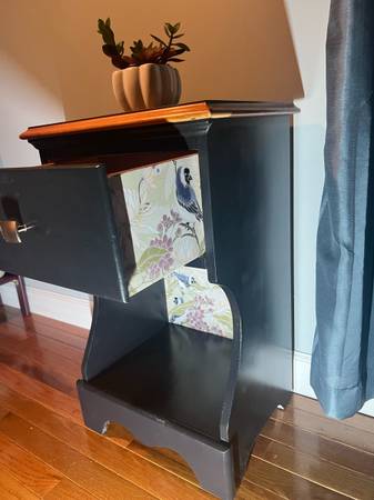 Actually found this guy on the side of the road, and nothing with wrong with it. Did my usual sanding and priming, remember always sand between coats. Removed the hardware and used bondo to cover up the groves and added just one hardware knob. Painted with the color Noir and left the top part alone. That was in excellent condition, so just had to use some wood conditioner. Used wallpaper as the backdrop and there he is!!