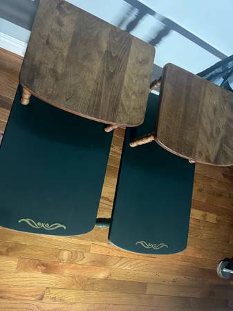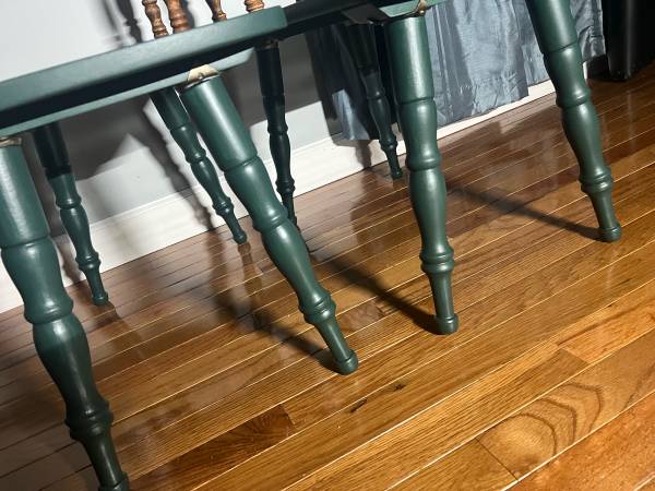 Since working outside being surrounded by nature, that’s what inspired me to use color hunter green. Used a little bit of gold leaf paint to mark the tip of the table and polished the wood.