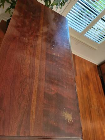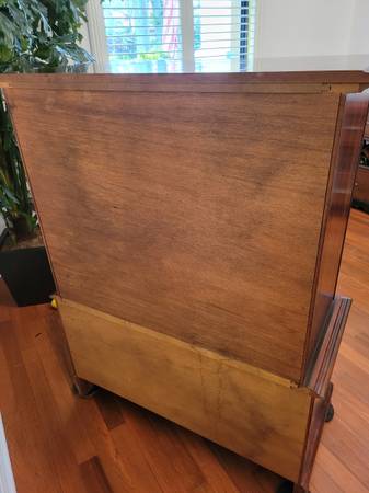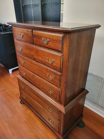 Traditional, solid wood bedroom chest of drawers/highboy with mahogany finish. Super clean inside, dovetailed drawers, all drawers glide smoothly. Original hardware. I don't know the maker, but it's a heavy, good, quality piece of furniture- it will take two people to move, but we can help you load. It's a little scuffed on top (see photo) but generally, it's in terrific condition.