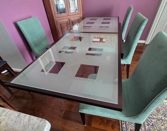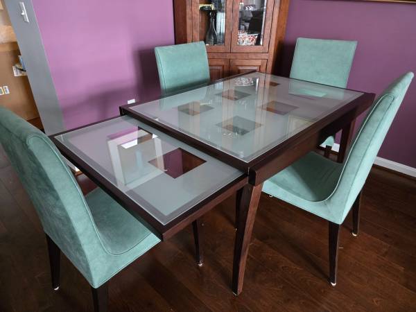 The chairs are generic, faux suede, not the matching Calligaris chairs but they coordinate well. I would sell the table for $850 separately if interested.