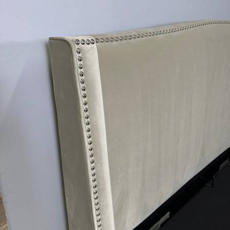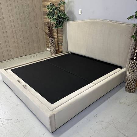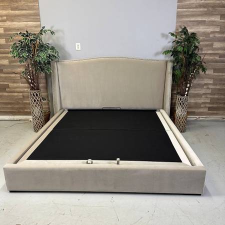 This is a King size Minori Storage Bed from Saatva — clean, modern, and super practical with a hydraulic lift-up base for hidden storage underneath. This one was a customer return, used for just 90 days. Still looks great — only has a couple of very minor scratches on the velvet (barely noticeable). Comes apart easily for moving and setup.