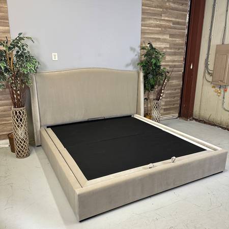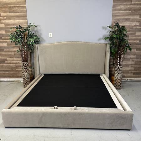 This is a King size Minori Storage Bed from Saatva — clean, modern, and super practical with a hydraulic lift-up base for hidden storage underneath. This one was a customer return, used for just 90 days. Still looks great — only has a couple of very minor scratches on the velvet (barely noticeable). Comes apart easily for moving and setup.
