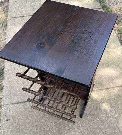 - Side table features bobbin and spindle magazine/newspaper racks on the sides.