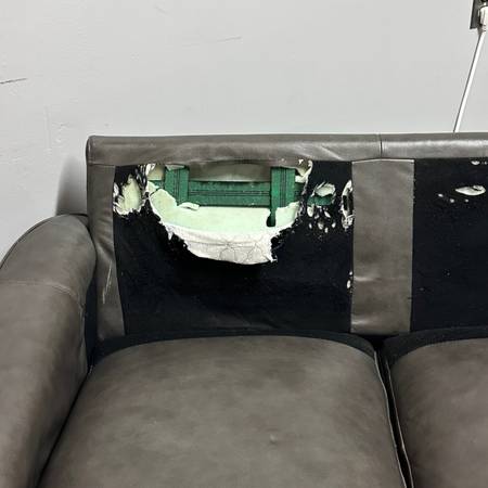 This leather sofa and loveseat set has some wear from use but is still in solid condition. A few cushions show light wear. The most wear is on the black fabric behind the cushions, which is torn up (see pictures) but the leather itself has no tears.
