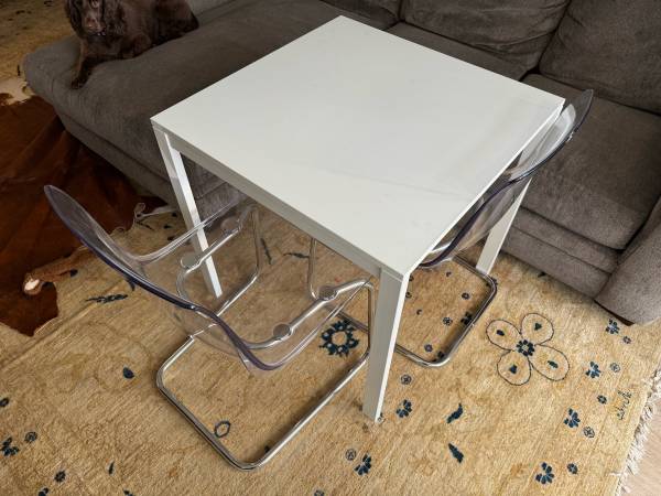 Vihals table (white) and 2 Tobias Chairs (clear) Lightly used in excellent condition. One of the chairs has minor scuffs on the backrest. Table dimensions: 29”x29”x29” (LxWxH) Pick up only, no...
