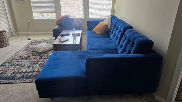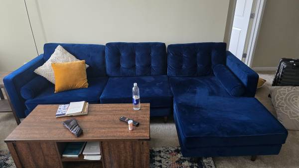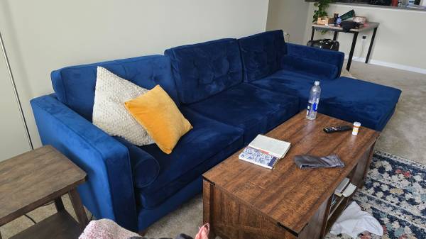 Gorgeous royal-blue/cobalt velvet sectional from Joybird (Braxton model), about 1 year old. The velvet is incredibly soft and visually striking, yet the seating is on the firmer side—more supportive than sinking in, making it very comfortable. Design features clean mid-century lines, retro charm, and quality build.