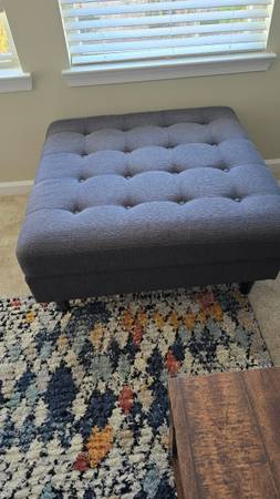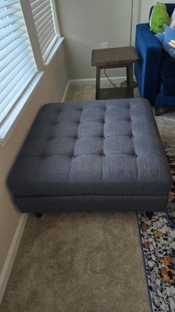 Large tufted square ottoman in gray. Modern, clean look — works as a coffee table, footrest, or extra seating. Size is about 35" x 35" (nice and roomy). Gently used, great condition. No stains or...