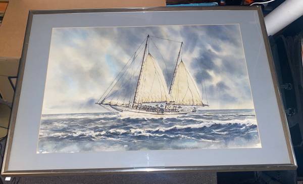 Large Watercolor “ . Local Artist Marion J. DILEY. Maryland TITLE: “Bugeye Trader Horn” . Dimensions: 24”x36” wide