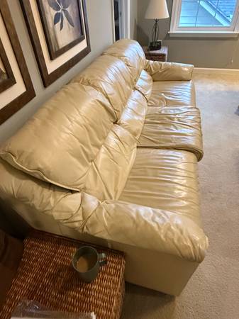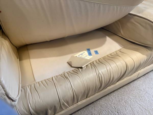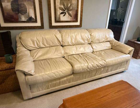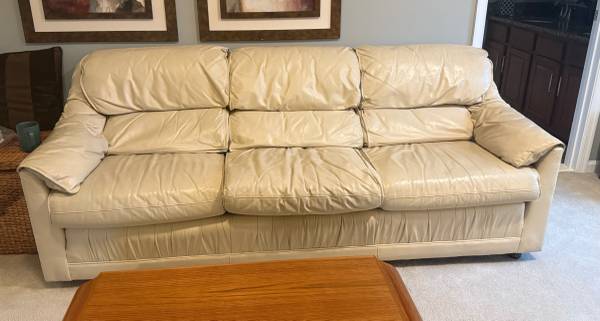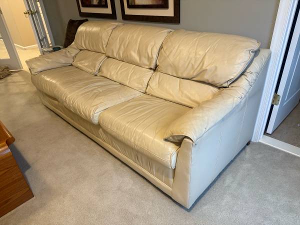 Leathercraft top-grain Italian leather in cream color. Three seats and cushy arm rests. Very comfortable. There is some wear as would expect from she. One side shows more. See photos. Dimensions:...