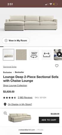 Like new Crate and Barrel Lounge Deep 2-Piece Sectional Sofa with Chaise Lounge.