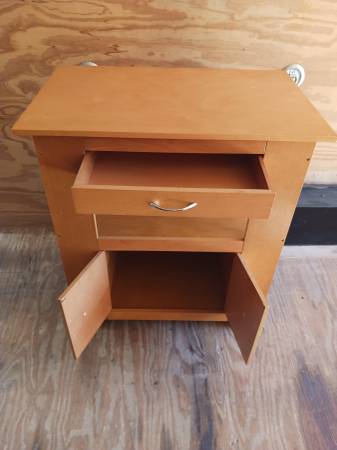 Mission style kitchen cart / table. Could be used as extra counter space or microwave cart. Solid wood. I am not sure the type of wood but the color looks like medium oak??? It is reversible, the draw and door open from both sides the same. It is not on wheels. $125.00