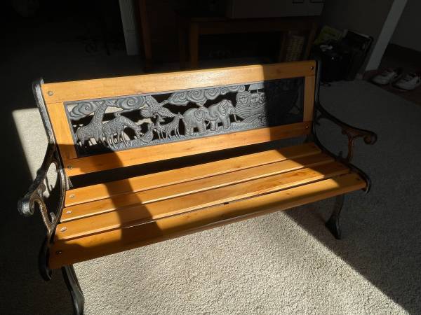 This bench is for children and can be used outdoor or indoor. The seating is made of wood with an iron frame. It is 32.5" long, 14" front to back and 18" high. The seat itself measures 9" off the ground. It is suitable for multiple ages depending on the size of the child.