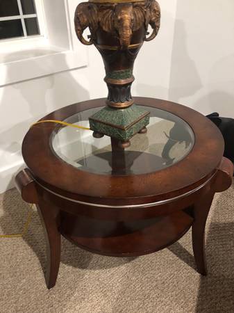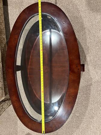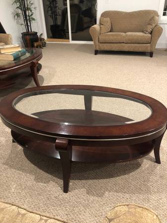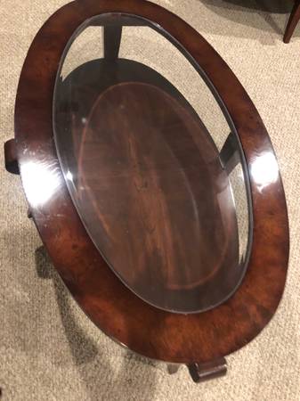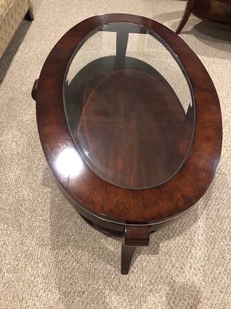 Beautiful oval Glass and cherry wood coffee table With a matching round side/end table. The pair of cocktail table with side table is in excellent condition like new was displayed in a formal living...
