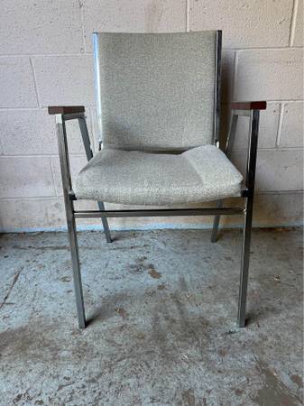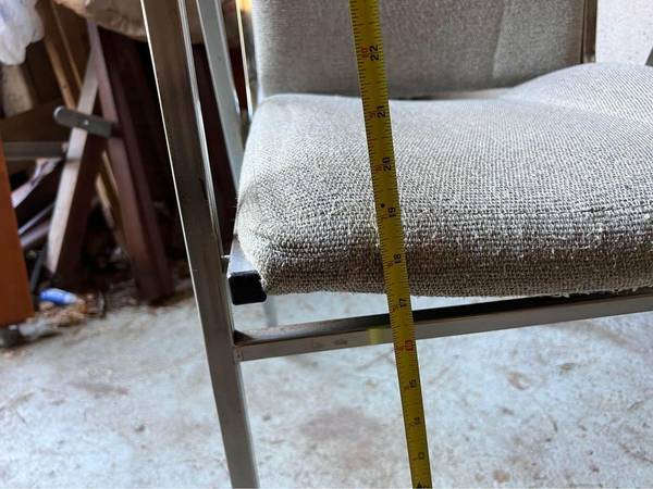 "Mid Century Chrome Base Upholstered Armchair. Height 33.1/2” width 21” depth 20”. Floor to Seat 18”. Floor to arm 26”. Excellent Condition. Pick up local or delivery available. "