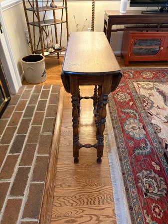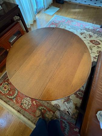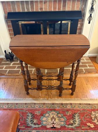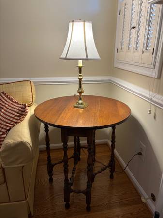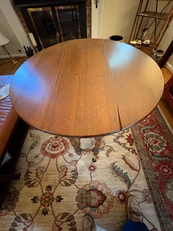 Brandt drop leaf gateleg table, early to mid-20th century, mahogany. Dimensions: 29" Tall, 29.5" round when open, 11.5 inches wide when fully closed.