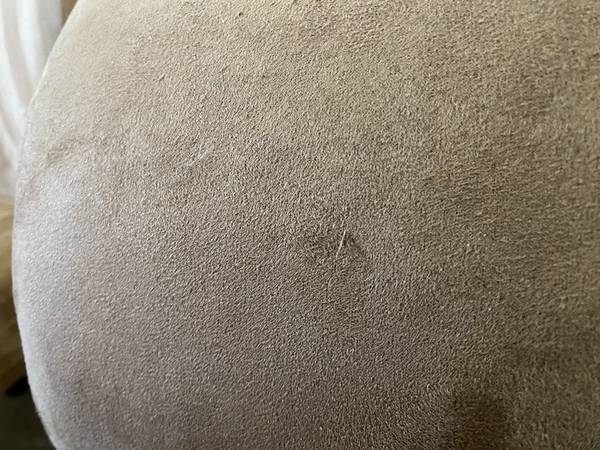 Comfortable, gently used, desert tan couch from a child-free, non-smoking household. Soft microfiber upholstery makes it very comfy for lazy afternoon naps. Minor normal wear and tear, a few pulled threads, one faint stain.