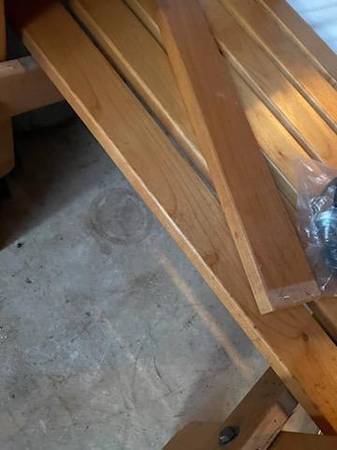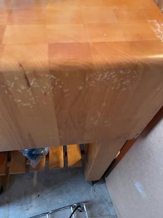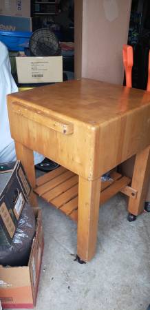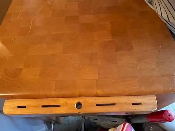 This solid maple chopping block is a wonderful addition to any kitchen. It has a knife holder, its on wheels and with it being 2' square by 35" high it can be used even in a small apartment. There are some scratches and a board that needs to be nailed down but overall in great condition for its age.