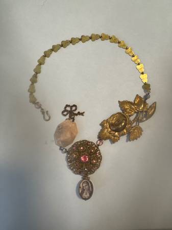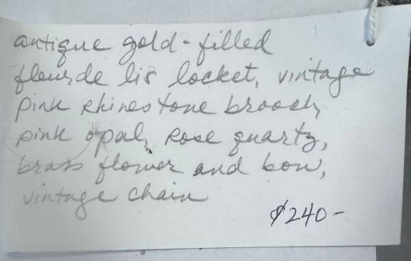 Antique gold filled fleur de lis locket, vintage pink rhinestone brooch, pink opal rosequartz, brass flower and bow, vintage chain.