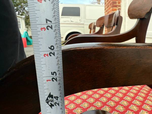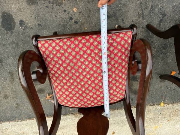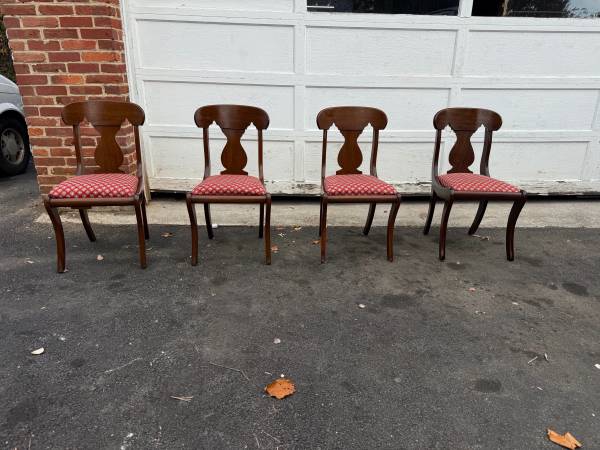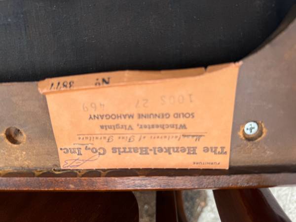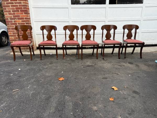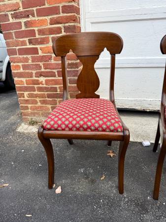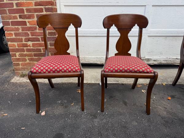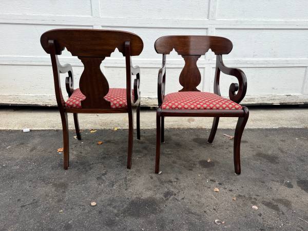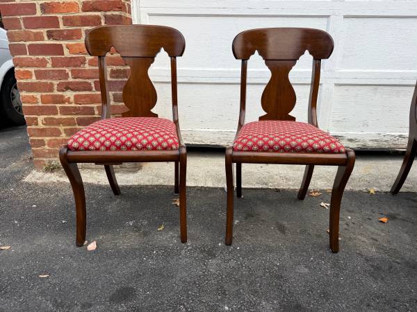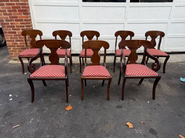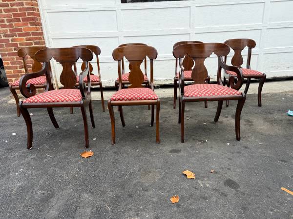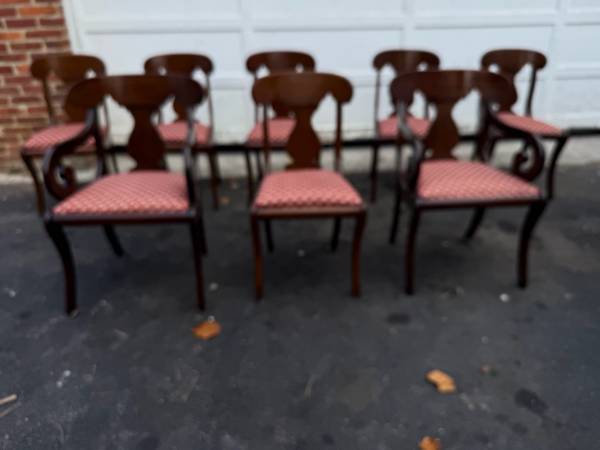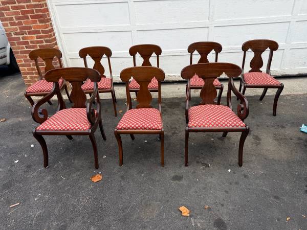 Henkel Harris American Empire Style Cherry & Upholstered Dining Chairs Solid wood frame, scrolled arm. 6 side chairs and 2 armchairs Sturdy and strong