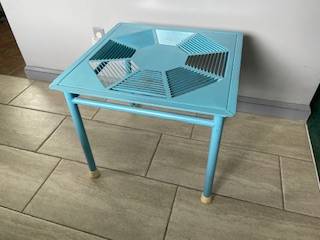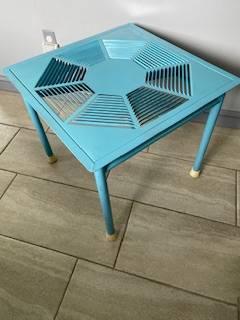 All metal table with rubber stops on feet. Measures 23.5 inches by 23.75 inches and is 20.5 inches tall. Sturdy. Light blue. Can be used as an end table or side table or something else. One of a...