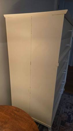 Link Taylor mid-century modern highboy dresser with 6 drawers. Solid wood. Off-white color. Original handles were replaced with white metal pulls. Left side has a vertical split halfway back that does not affect the integrity or function of the piece. This belonged to my great uncle in Lancaster, PA.