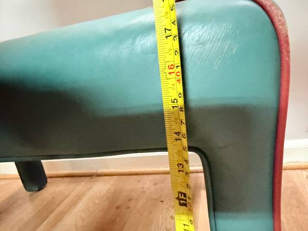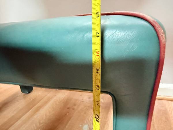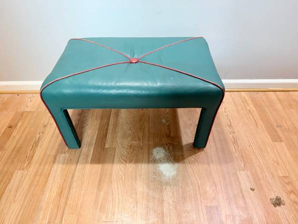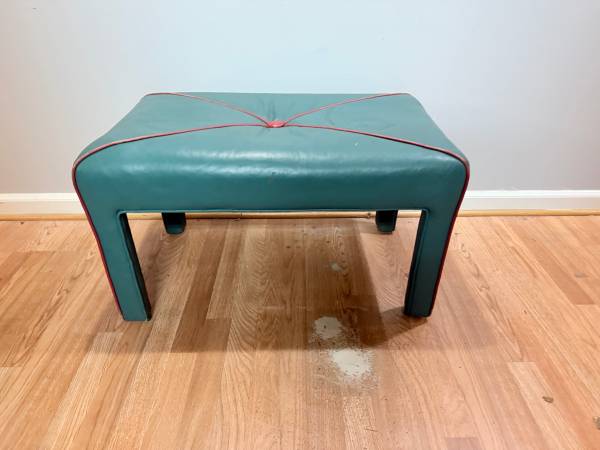 mid-century modern-style ottoman or footstool with a tufted teal-green faux leather cushion and red piping in