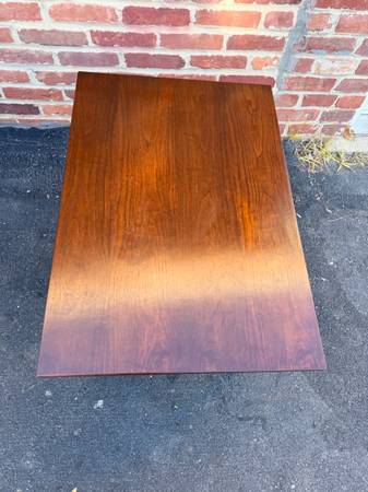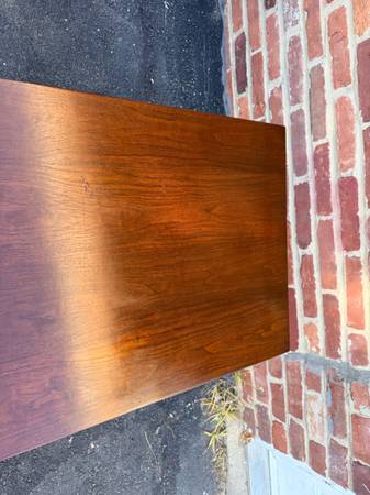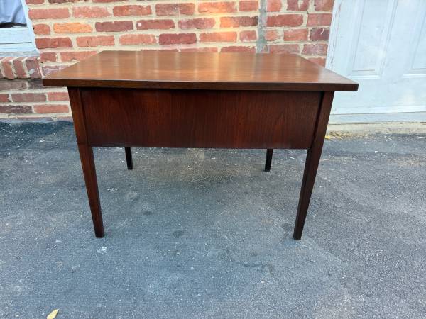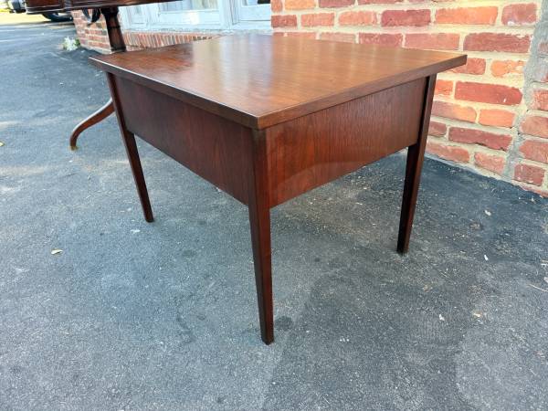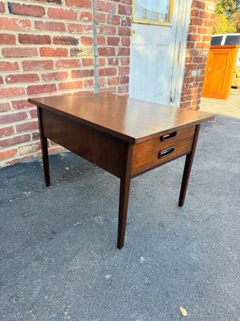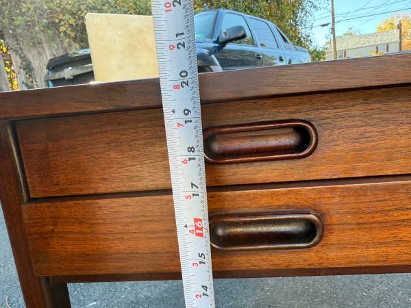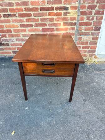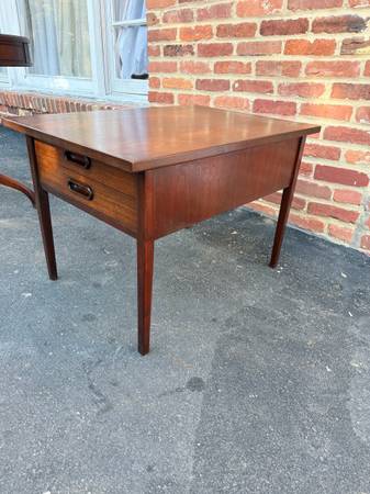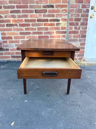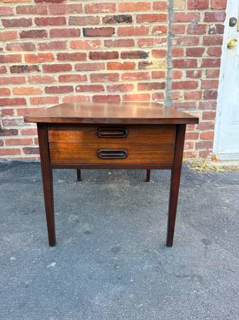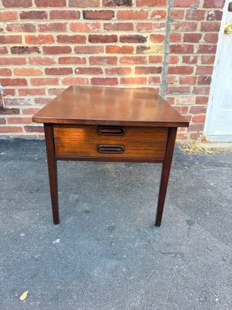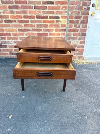 Mid Century Modern Two Drawer End Table with Carved Wood Pulls Unmarked, sturdy , dovetail joint construction