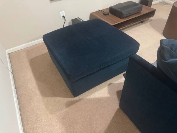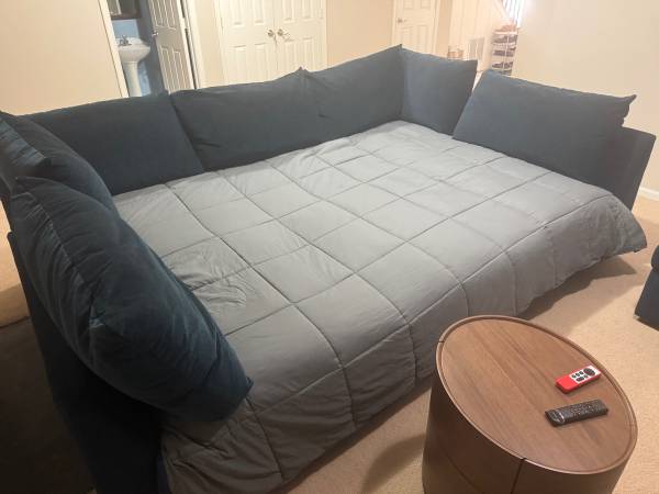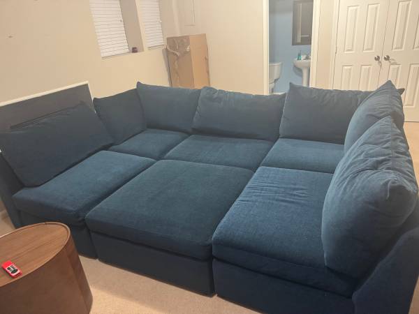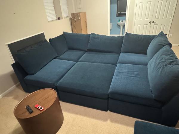 Selling this awesome blue pit couch because I am moving to a smaller location and it won’t fit! Very comfortable (chenille) and is great for a rec room or a man cave!