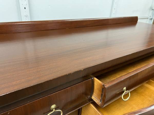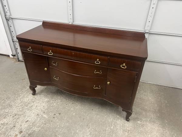 Well built and sturdy. Drawers are dovetailed and slide well. Doors swing and latch as they should. Entire piece is solid wood wrapped in veneer. Some small chips to veneer along front edge (pictured).