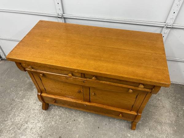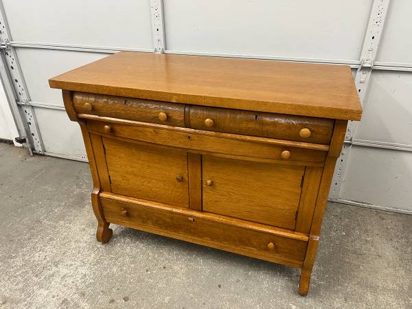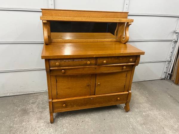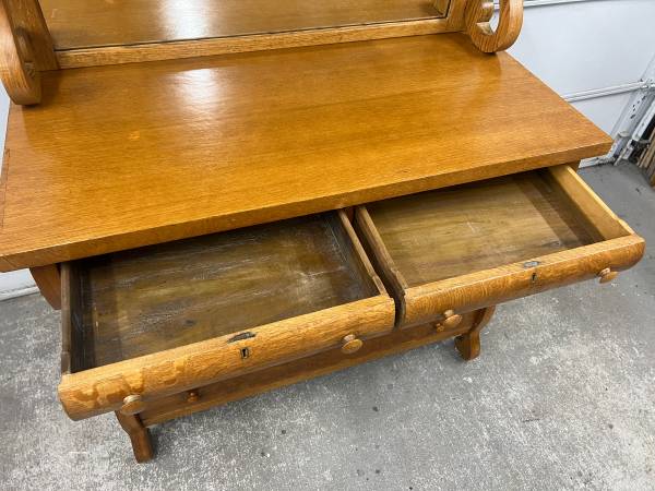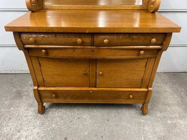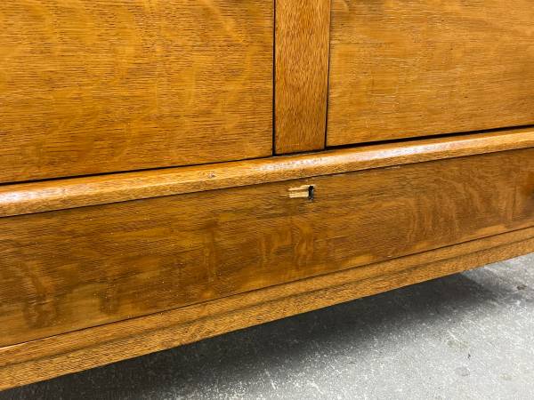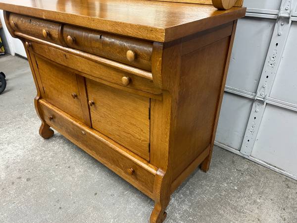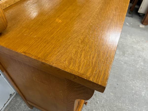 Buffet is solid wood wrapped in veneer. Drawers are dovetailed. Bottom drawer a little sticky. Mirror is removable for easier transport or a different look. Some veneer damage to bottom drawer front. Evidence of patches to veneer on cabinet surface (damage is pictured).