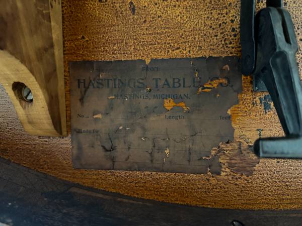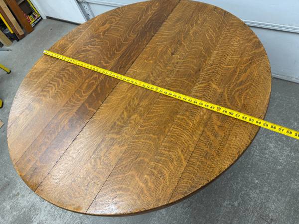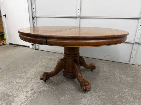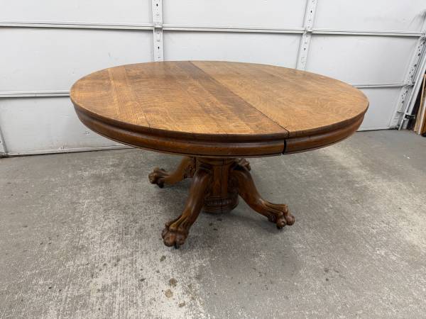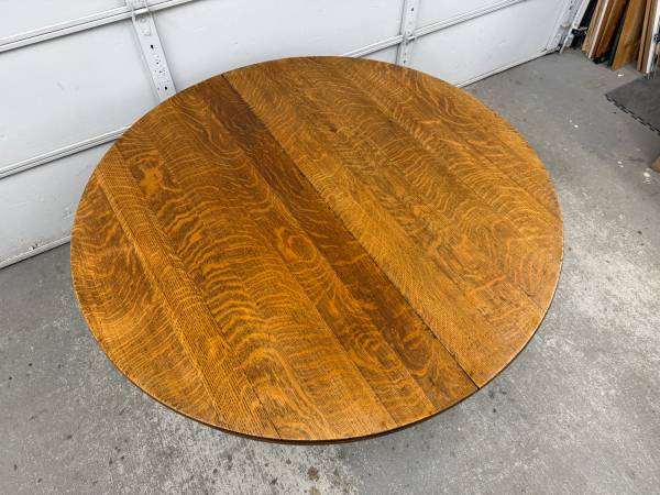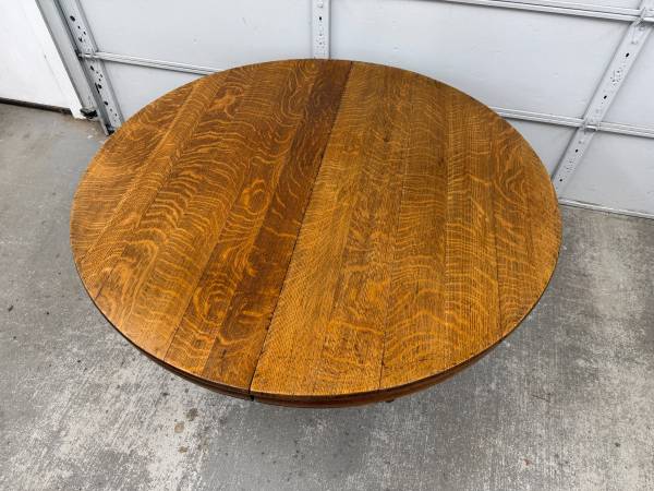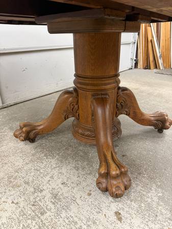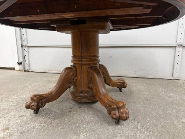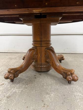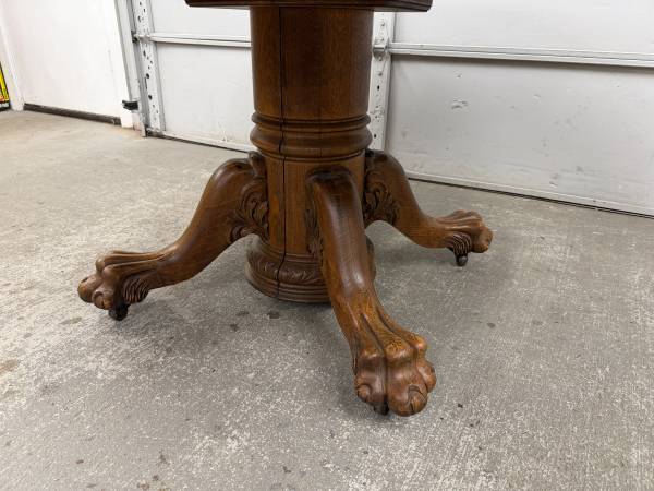 Table is made of solid oak and sturdy. Base is hand carved. Table top is removable from base for easier transport. Table does not come with leaves and does not expand. Table sits on metal casters.