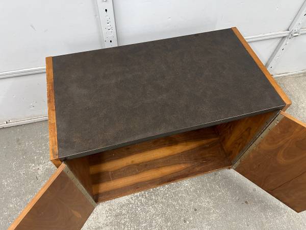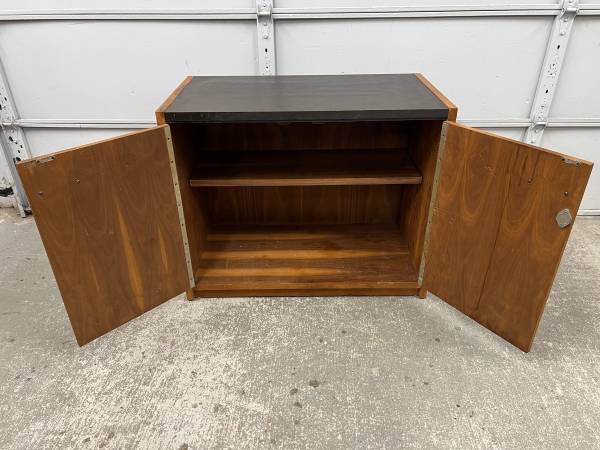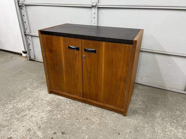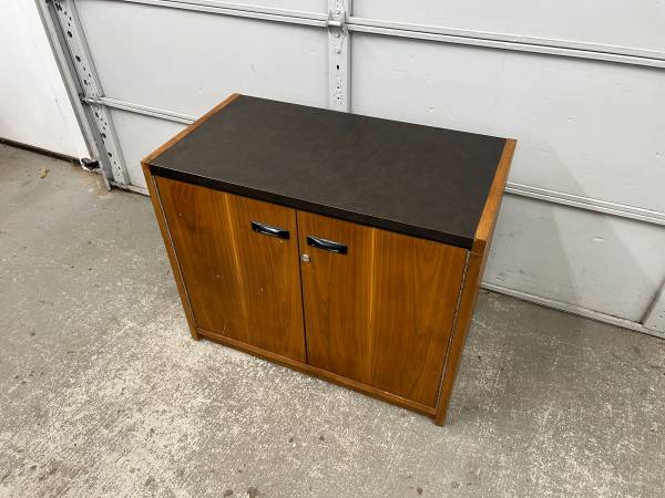 Cabinet is well built and sturdy - heavy! Veneered particle board construction. Doors swing as they should. Does not come with a key, doors cannot be locked. Cabinet was used for craft storage supplies and shows signs of use. Surface scratches and chips throughout. Shelf inside cabinet is adjustable in height or removable. Stamped 1981 on bottom, made in Canada by Biltrite.
