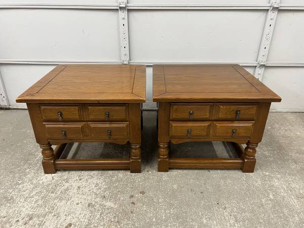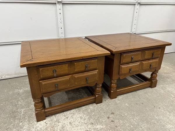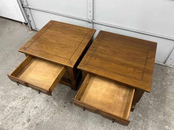 21" tall 26.5" square top Tables are solid oak and heavy! Drawers slide well. Delivery available for $50 within 10 miles of Fairfax Station. Longer distances possible for an additional fee. Check...
