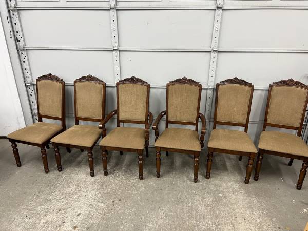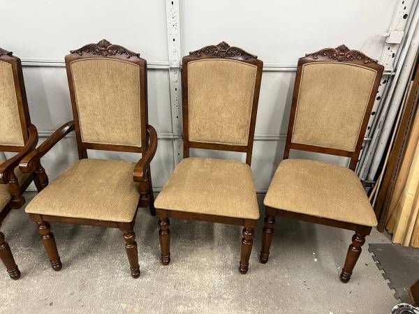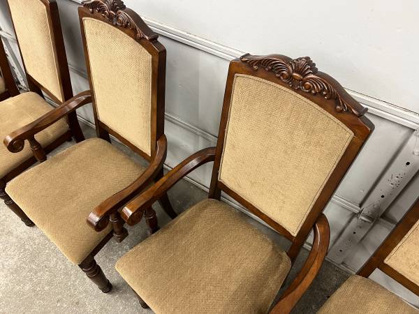 Made to look old/vintage but are manufactured. Chair frames are solid wood and sturdy. Chairs are comfortable. Upholstery in overall good shape but have some damage. Two seats pictured on the left are creased. One other chair has small spot blemish (damage is pictured).