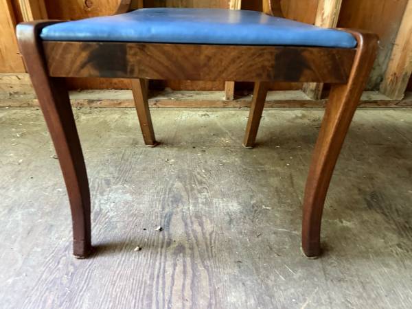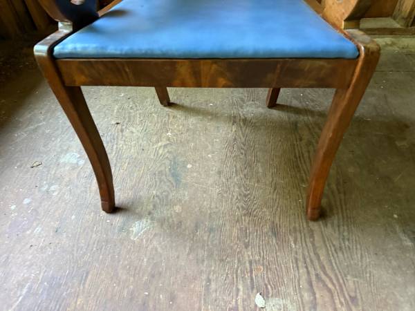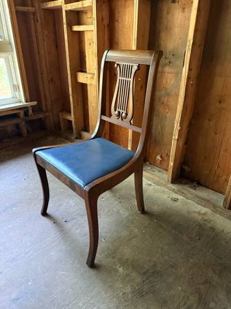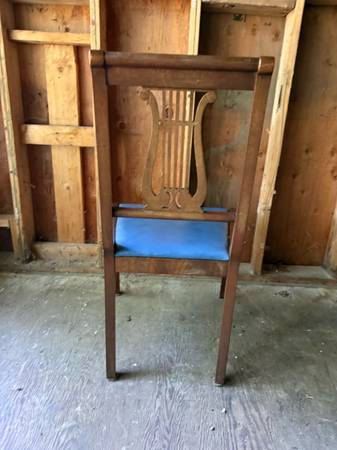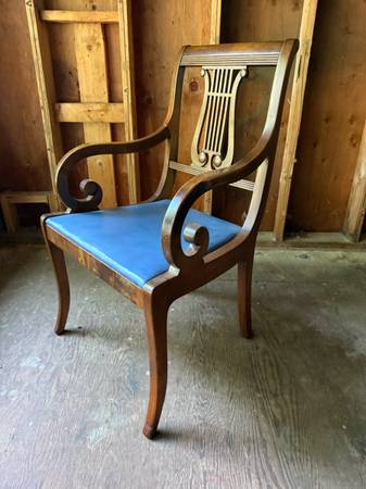 Vintage Regency Duncan Phyfe Style Harp Back Lyre Back Upholstered Dining Chairs Set of 6. Good condition with its age and use Sturdy and strong Made of mahogany and featuring a unique lyre harp back