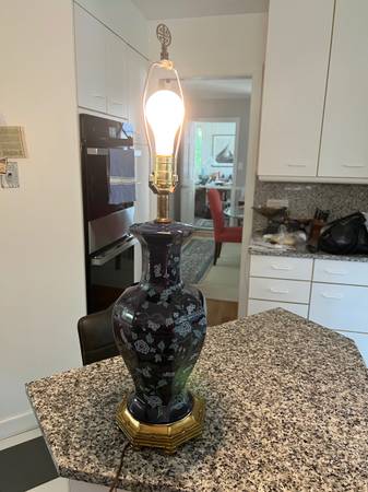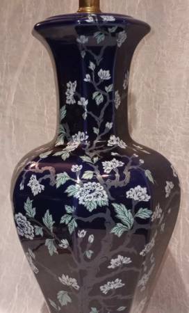 Mid-Century Modern Ceramic Colbalt Blue 3-Way Switch Lamp With Hand Painted Cherry Blossom Tree With Flowers. In very good gently used condition No chips or cracks. The shade shown comes with the lamp - it’s a rustic oiled parchment shade in wonderful condition; yet, I believe the lamp may look even better with another shade .