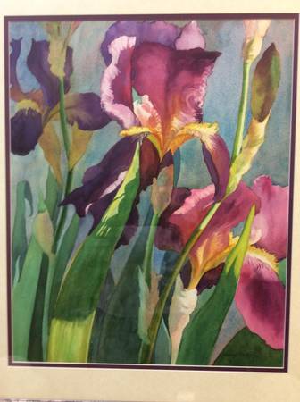 Original hand painted, signed, watercolor of Iris flowers. Painted by Nancy Baldrica, signature in lower right (see photos). Stunning deep purples, yellows, greens, and other colors. Vintage painting likely from 1980s, early 1990s. Larger piece, framed about 36" High x 30" wide. Professionally framed.