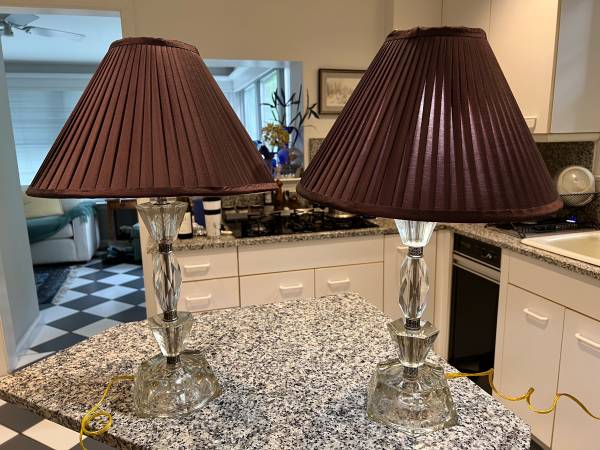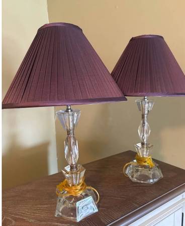 - Vintage etched glass table lamps with a traditional design - Made from high-quality glass for a stunning appearance - Features vibrant lined purple shades to add a pop of color- both shades are in...