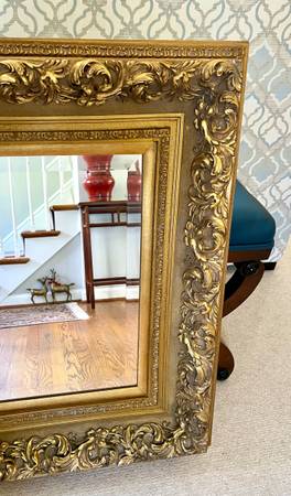 This is a really gorgeous mirror in pristine condition with no cracks, dings, chips or scratches. Hardware is installed to hang this vertically but you can easily move or add new hardware to hang this horizontally.