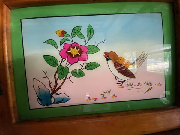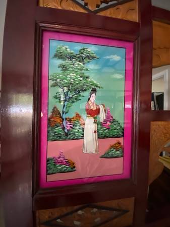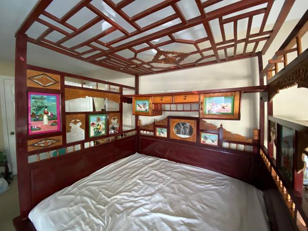 Elaborate Vintage Chinese Canopy Bed with Reverse Painted Glass Panels, Carved Details & Storage Compartments