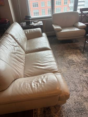 I'm selling my leather couch and matching swivel chair. The set is off-white, with the couch measuring 87x38x34 and the chair 37x35x33. Excellent condition, pick up only.