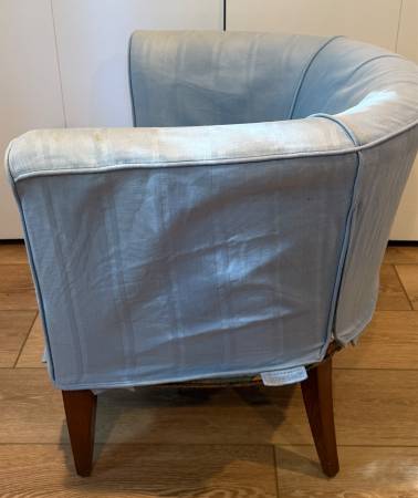 ($125 ea) 2 ACCENT CHAIRS, Round Barrel style, fabric, low profile, very comfortable, neutral toned or have pastel covers. Solidly built and heavy duty. Like new, but pastel covers are a little...