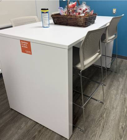 The office is downsizing and our team is selling the office furnitures. Currently, we have 1 high top table for sale and 4 high top chairs.