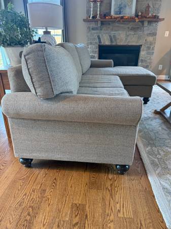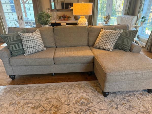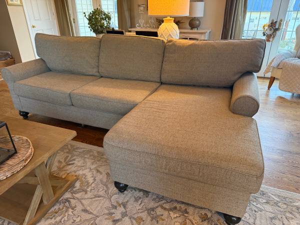 Great sectional for families in a neutral tweed fabric. Bought it at Belfort a few years ago and they still sell the same one.