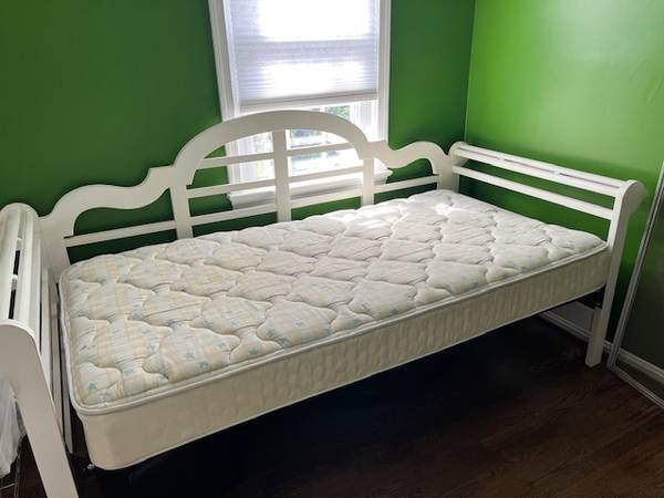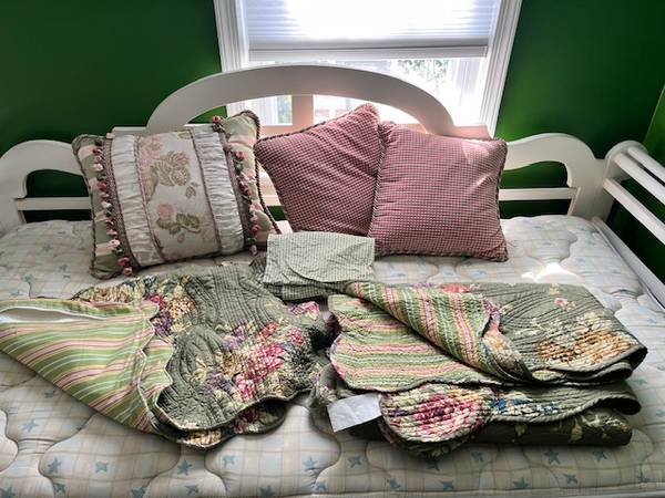 Wooden frame - very good condition Very pretty matching bedding consisting of pillows, pillow cases and shams, and bed throw Mattress - included if you like Weekend pickup preferred.